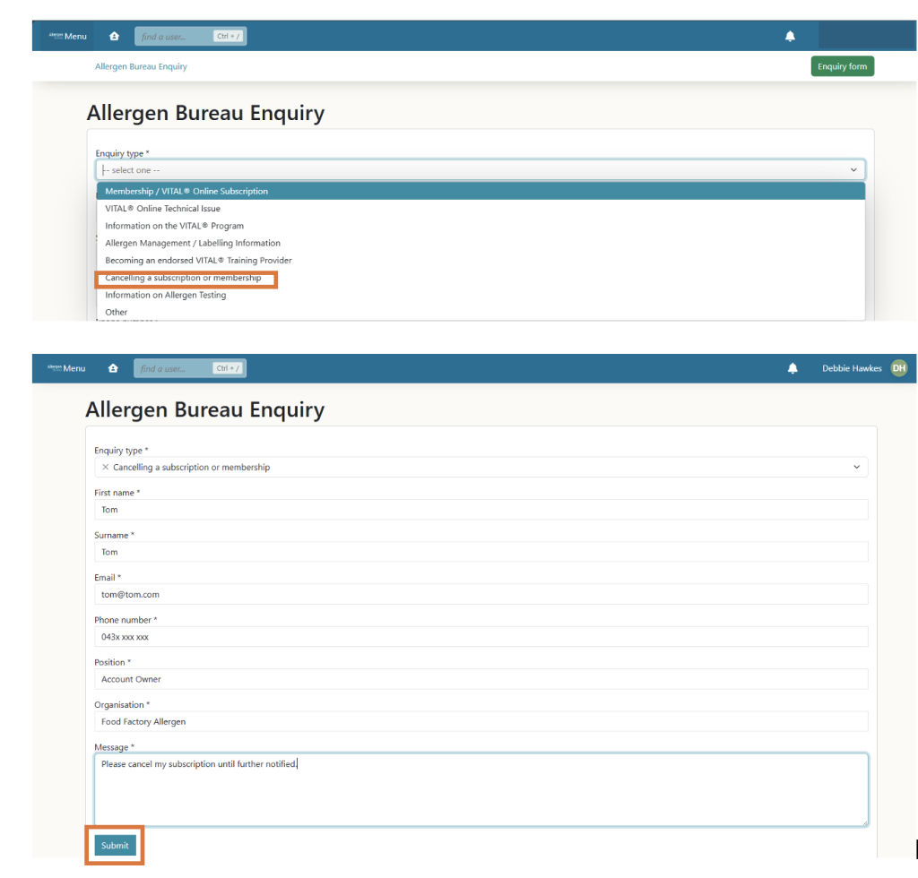 Click here to access the form and choose the Enquiry type: Cancelling a subscription or membership. The Allergen Bureau team will act upon the request and confirm action by email.