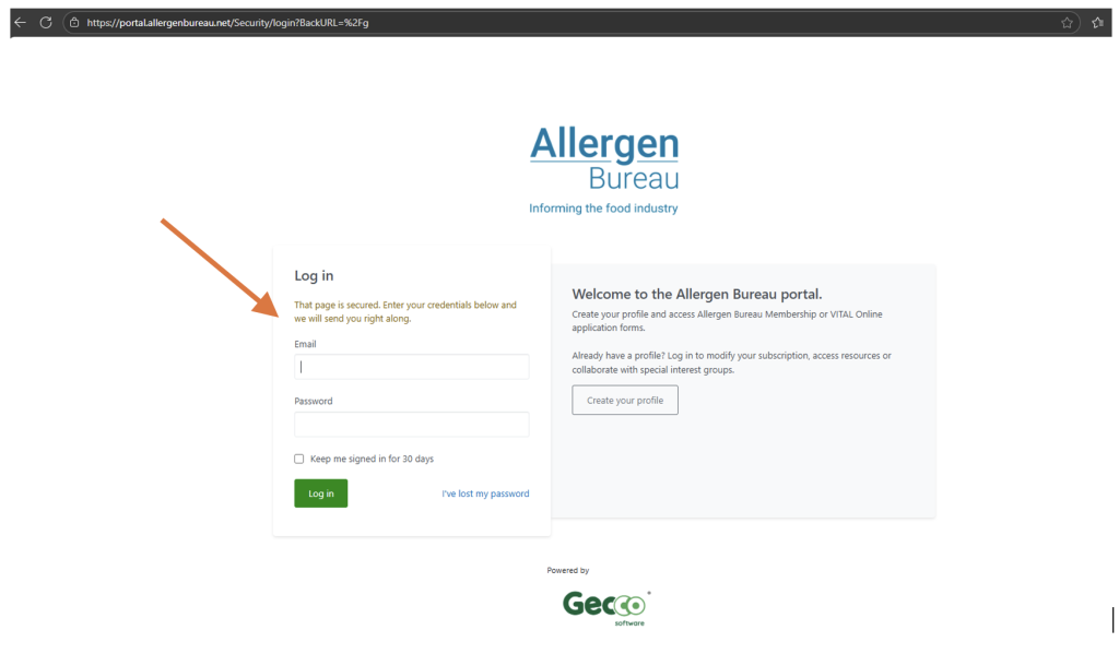 This will take you to the Allergen Bureau portal, where you will use your email and portal password to enter the system.