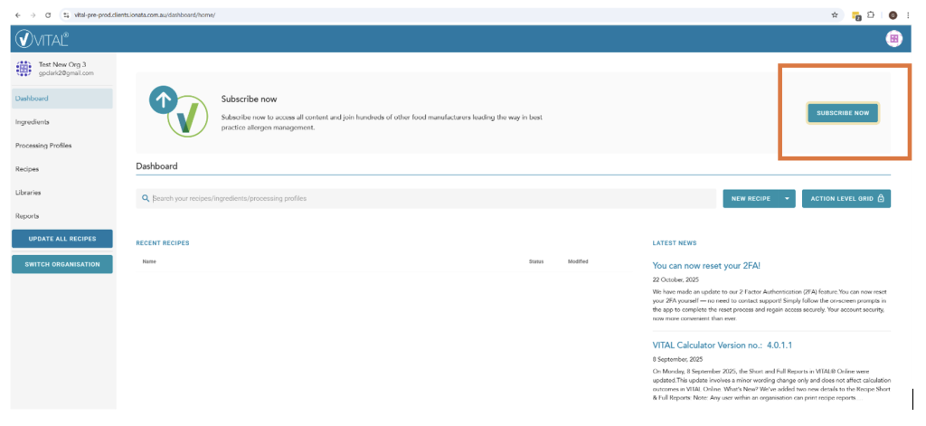 To upgrade your subscription from within VITAL Online use the Subscribe now button.
